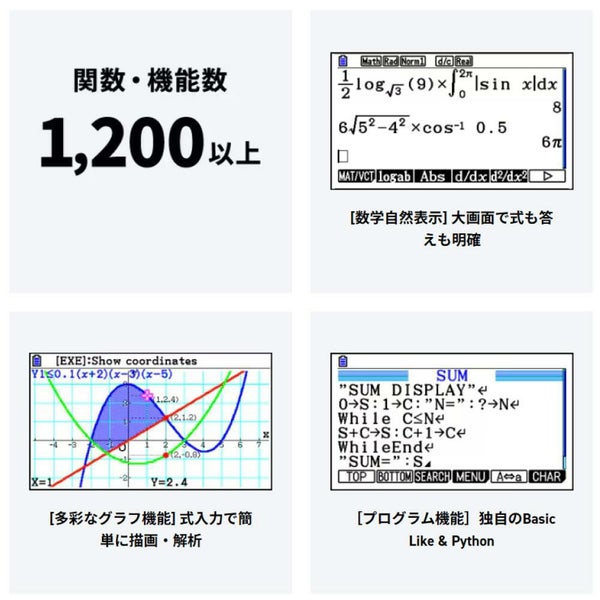 数学自然表示 関数・機能:1200以上 変数メモリー:28 プログラム機能・容量:Python/Basic‐Like・最大61,000バイト 保存メモリー容量:最大16Mバイト 液晶表示:384×216ドット・カラー65,536色