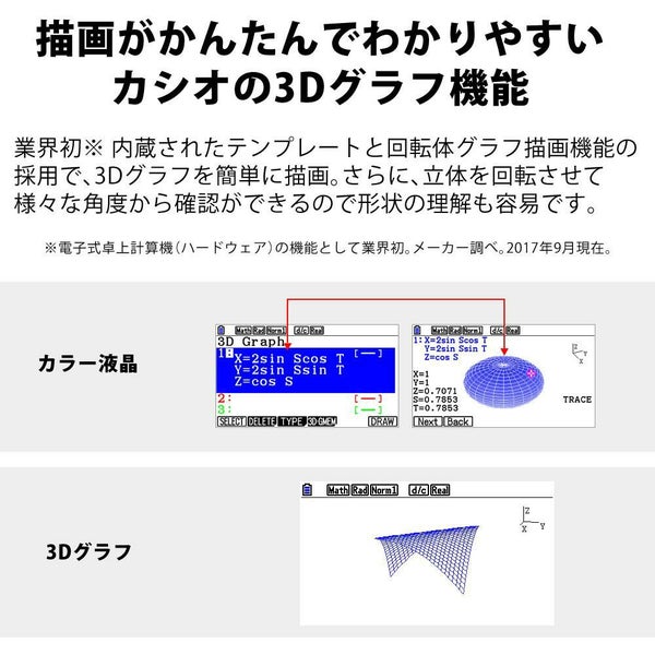 | グラフ応用機能 | テーブル&グラフ機能 デュアルグラフ機能 オーバーライトグラフ機能(異なる係数のグラフの同時描画) 動くグラフ(ダイナミックグラフ) ピクチャープロット【出荷時書込み済みアドイン機能】(画像のグラフ解析) |