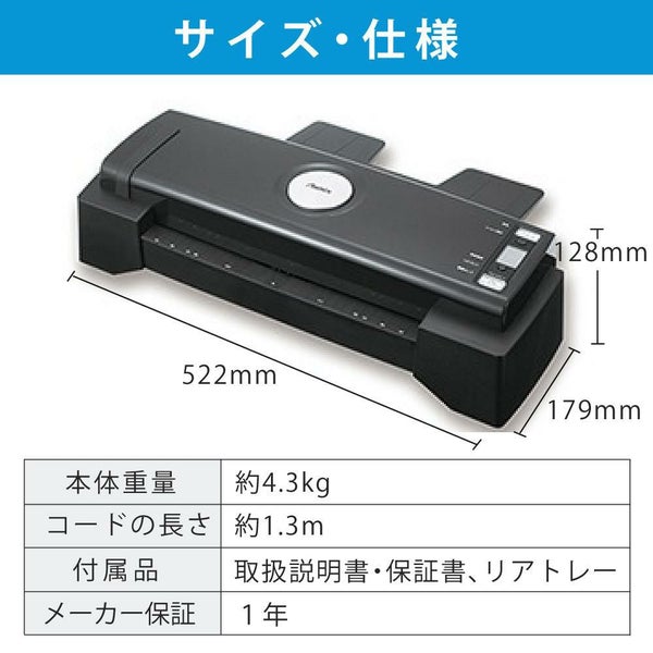 ・最大ラミネート厚 1.0mm:75・100・150・250μ(マイクロ)のフィルム対応
