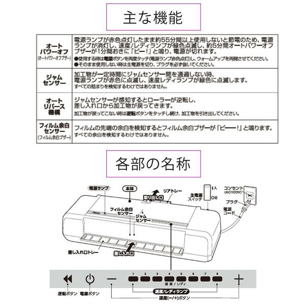 検索ワード:アスミックス アズミックス アスカ あすか ラミネーター らみねーたー ラミ ラミネート パウチ ラミネーター本体 本体 ホットラミネート パウチラミネーター A4サイズ A4対応 A4 A4ラミネーター A4ラミネート ホワイト 白 L413A3 4本ローラー 4本 ローラー A3対応 A3 最大厚 0.8mm 250ミクロン 250μ 250μm 250マイクロメートル 0.25mm 325mm幅 325mm ウォームアップ 48秒 高速起動 最速 起動 マイコン式温度速度コントロール 電子式速度コントロール オートリバース フィルム余白センサー 逆転ボタン オートパワーオフ 一体型リアトレー