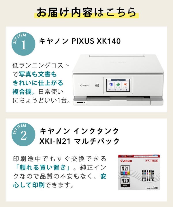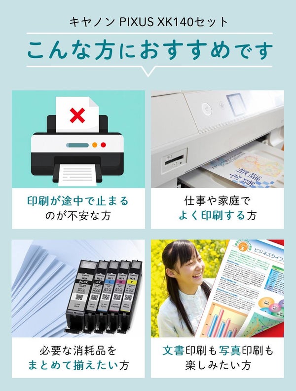 高画質・高機能をコンパクトに凝縮したキヤノン PIXUS XK140。プリンター複合機として、家庭でもオフィスでも信頼の1台です。