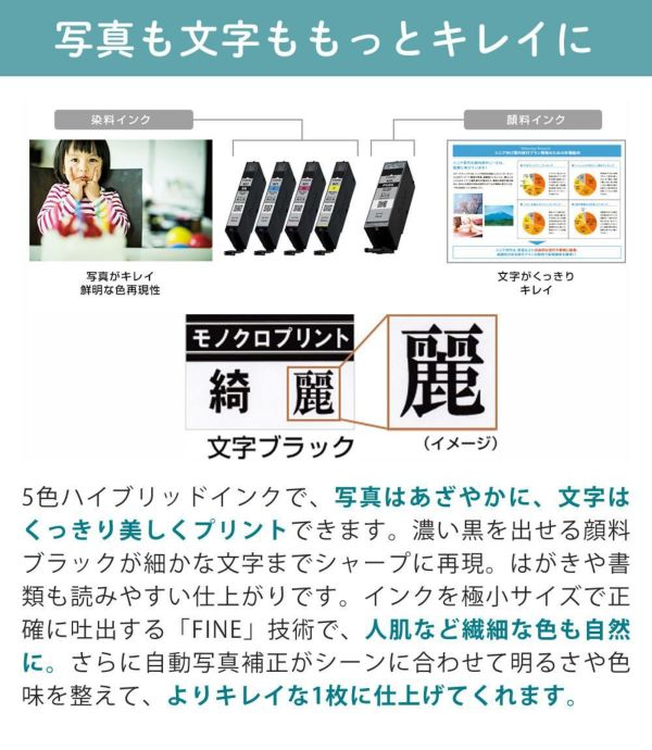 染料と顔料の2種類のブラックインクを搭載し、文字も写真も鮮明に再現。家庭用プリンターとしても、年賀状や写真印刷に最適です。インクタンクは純正品対応で、安定した発色と長寿命を実現します。