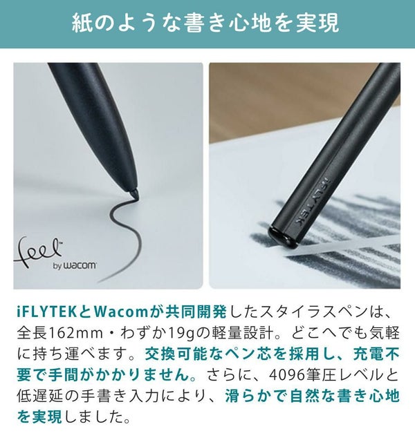 Wacom社と共同開発した4096筆圧対応ペンが、紙のような書き心地を再現。
