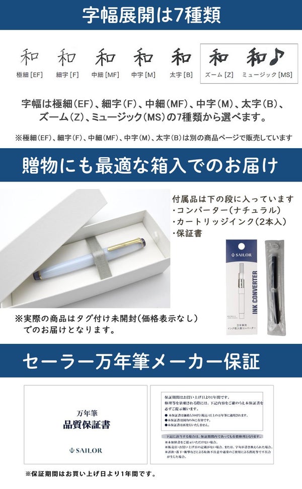 | 付属品 | カートリッジインク(ブラック)2本、コンバーター(ナチュラル)1本、セーラー万年筆保証書 |