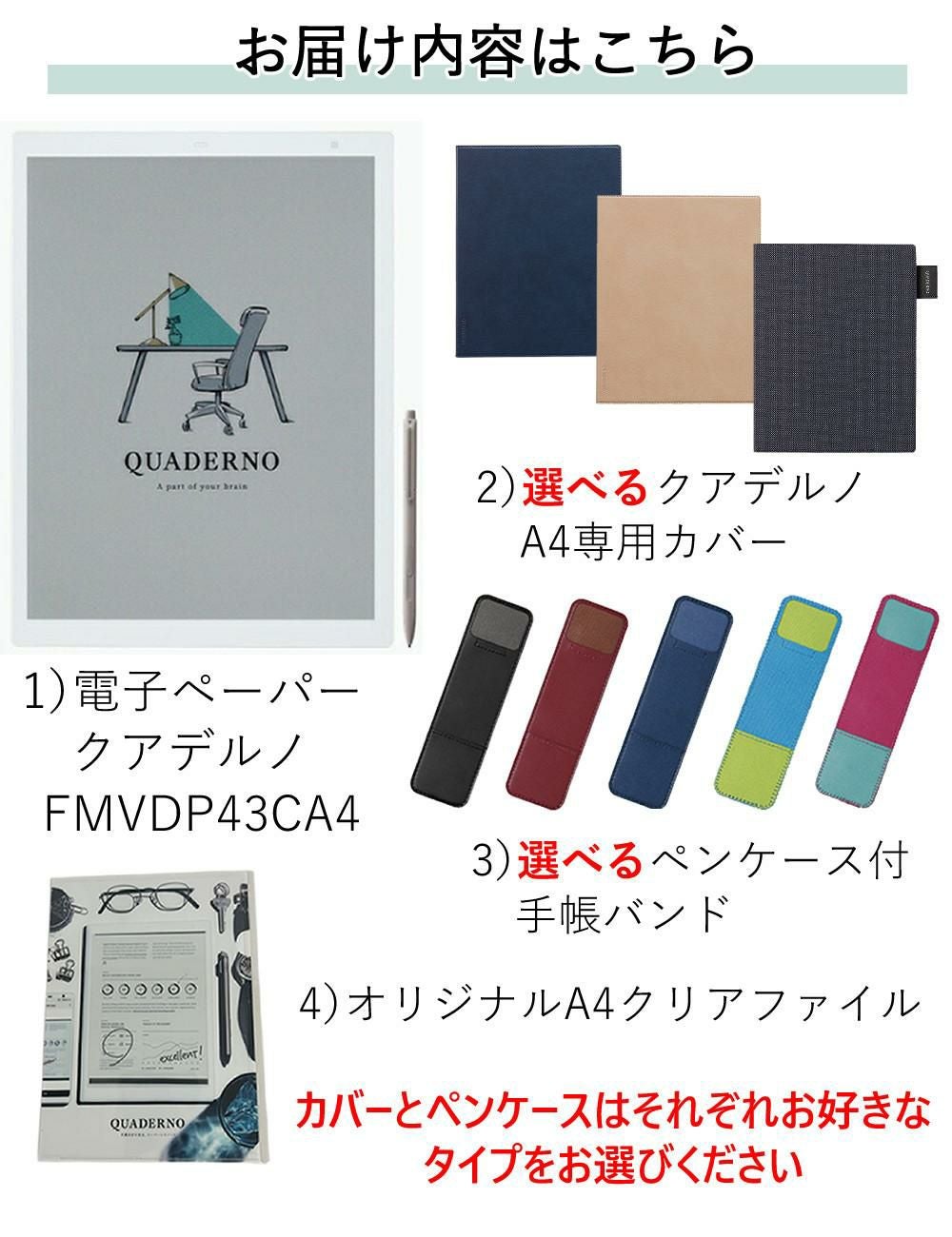 他の画像を見る 「紙のような書き心地。カラー表示でさらに進化した『クアデルノ』電子ペーパー!」 富士通 FMVDP53CA5 電子ペーパー クアデルノ QUADERNO A5 (Gen. 3C) 選べる専用ケース ペンケース ラミーペン クリアファイル セット(ラッピング不可) 販売価格 ¥ 75,980 税込 カートに入れる お気に入りに登録する (0件)