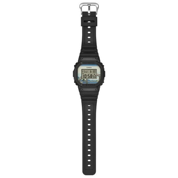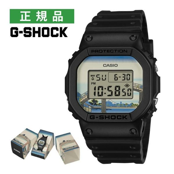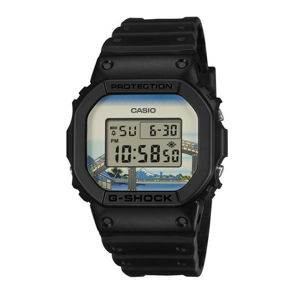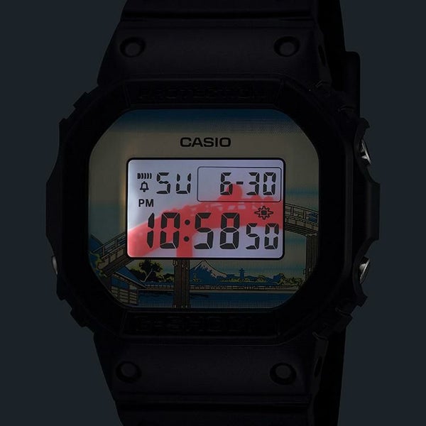 1983年の発売以来、飽くなき強さを求めて進化を続けるタフネスウオッチG-SHOCKから、江戸時代に活躍し国内外で広く知られている浮世絵画家、葛飾北斎の人気作品をデザインモチーフにしたモデルです。北斎の代表作である富嶽三十六景の中から「深川万年橋下」を採用しました。ベースモデルにはアイコニックな定番デジタルDW-5600を採用し、文字板には「深川万年橋下」を大胆にデザイン。LEDバックライト点灯時には文字板と一体となって深川万年橋の曲線美を表現します。裏蓋には漢字で“日本”という文字を刻印しました。
