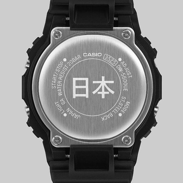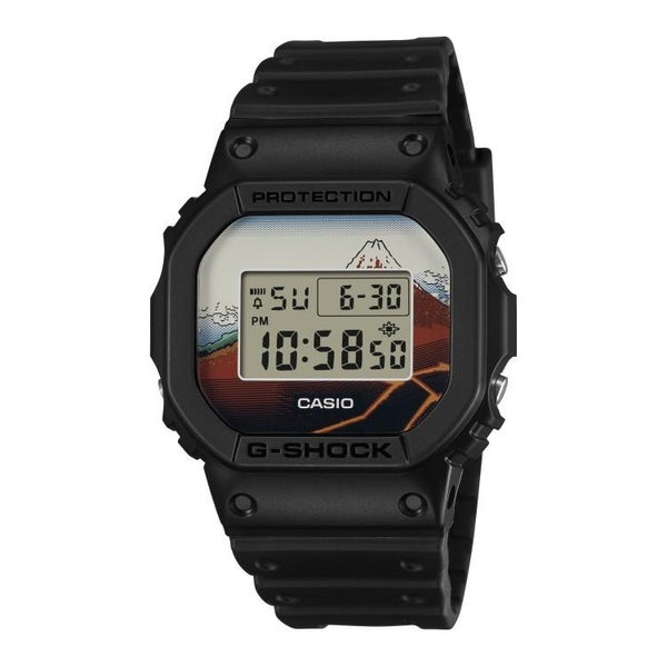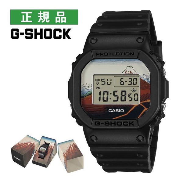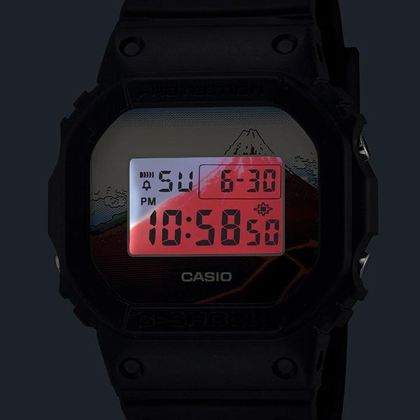 1983年の発売以来、飽くなき強さを求めて進化を続けるタフネスウオッチG-SHOCKから、江戸時代に活躍し国内外で広く知られている浮世絵画家、葛飾北斎の人気作品をデザインモチーフにしたモデルです。北斎の代表作である富嶽三十六景の中から「山下白雨」を採用しました。ベースモデルにはアイコニックな定番デジタルDW-5600を採用し、文字板には「山下白雨」を大胆にデザイン。LEDバックライト点灯時には文字板と一体となって同作品の雄大さを表現します。裏蓋には漢字で“日本”という文字を刻印しました。