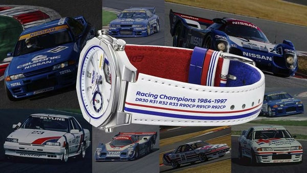 初代NISMOロゴを採用し、日産ワークスチームのカラーであったトリコロールがダイアルやバンドに映し出されています。バンドの裏側にも青と赤のトリコロールが施され、遊環には初期ユニフォームのストライプを再現。文字板上部の蓄光ロゴは、24時間レースのグループCレース車両の蓄光カーナンバーを思わせます。さらに、1984年から1997年までの間にシリーズチャンピオンを獲得した名車への敬意を込めて、バンドにはその各車名が印刷されています。富士1000kmレースで活躍したNISSAN R92CPの鯉のぼりデザインや、R32スカイラインの「ハチマキ」をイメージしたオレンジの帯など、細部にまでこだわりました。