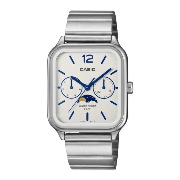 月の満ち欠けを確認できる、ムーンフェイズ機能付きのアナログ腕時計です。スタイリッシュな形状と複数のサブダイアルが印象的なモデルです。5気圧防水仕様で、手洗いや突然の雨でも安心です。