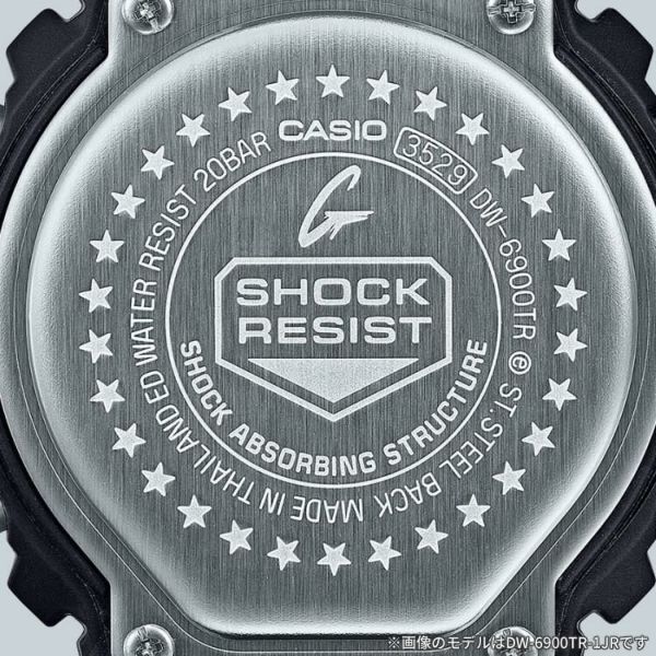 6900シリーズのデザインアイコンであるフロントボタンをメタル化し、ミラー仕上げの素材表面に刻まれた「G」マークが力強い存在感を放ちます。バックライト点灯時には、6900シリーズのデビューイヤーである「SINCE1995」が液晶に浮かび上がります。また、SHOCK RESISTマークを刻印した裏蓋に6900シリーズ誕生30周年を記念した星マークを30個レイアウト。パッケージにはブラック、レッド、イエローの3色を取り入れ、「G」マークをモチーフにしたDW-6900Hのパッケージデザインをオマージュ。ベゼル、バンドなどの主な樹脂パーツには環境負荷低減への貢献が期待されるバイオマスプラスチックを使用。6900シリーズのアニバーサリーイヤーを飾る特別仕様のデザインです。