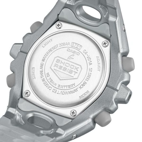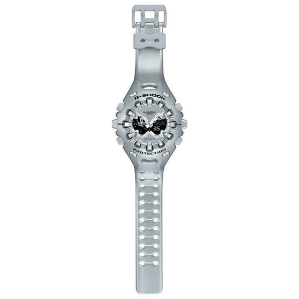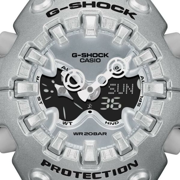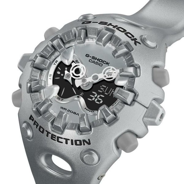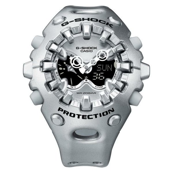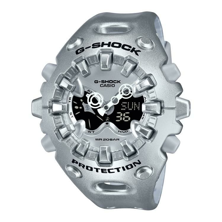 エッジの効いたパーツを組み合わせた有機的な外装フォルム、2つの穴が大きな特徴となっている新開発のショックリリース針など、今までの常識を覆す斬新な発想で、強さを求めて挑戦を続けるG-SHOCKのアイデンティティを形にしました。モジュールを保護するセンターケースを、ベゼル・バンド一体構造の外装パーツでカバー。大型の立体インデックスをガラス上面に配置することで、衝撃を緩和するバンパーの役割を持たせました。G-SHOCK独自の耐衝撃性能をキープしながら、ユニークかつ力強い外装デザインを実現しています。衝撃の影響を受けやすい針をシャフトに固定せず、磁石の力で取り付けるマグネティックホールディング構造を開発しました。この構造で取り付けたショックリリース針(分針)は、磁力で固定されているため、受けた衝撃を受け流すことができます。本構造を採用することで、針の大型化やデザインの自由度を上げることが可能になりました。
