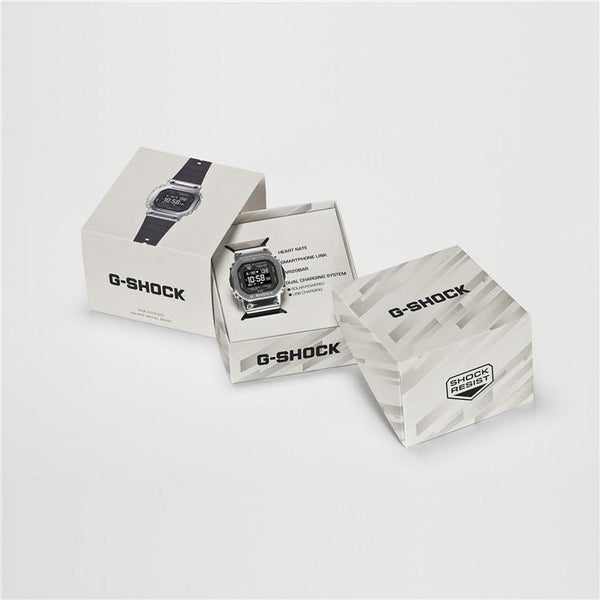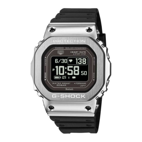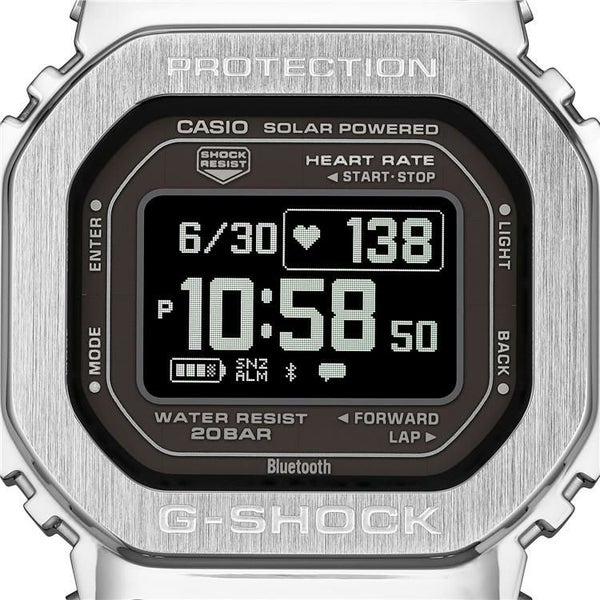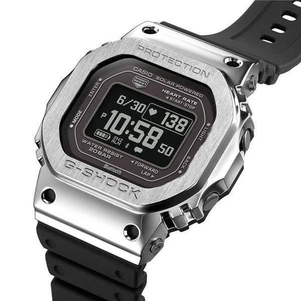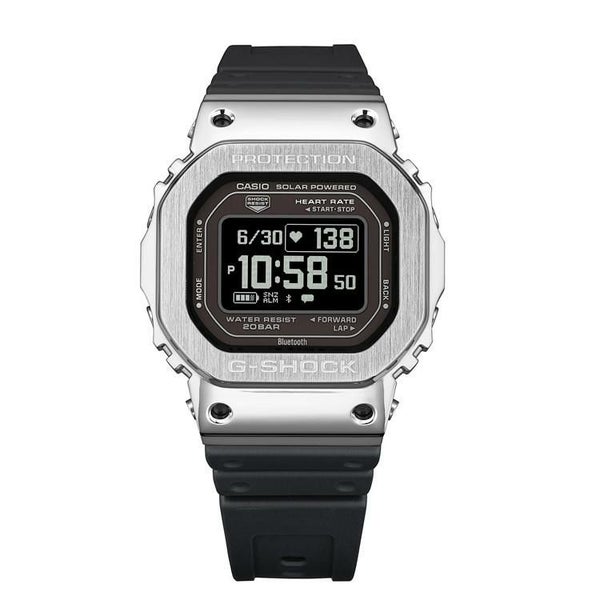 DW-H5600の機能はそのままに、ベゼル部分にステンレススチールを採用し、より幅広いシーンで着用できる仕上がりとしました。さらに、ベゼルのディンプル部分に4カ所の切削穴を設けることで、ハイテクギア感とスポーティーな印象を高めています。また、裏蓋にはカーボンファイバー強化樹脂ケースを採用。ワークアウトに役立つ機能として、心拍計測が可能な光学式センサー、歩数計測が可能な加速度センサーを搭載。ランニング、ウォーキングやワークアウトに対応しています。また、ポラール社ライブラリによるトレーニング解析、睡眠による回復度の解析、呼吸エクササイズ等が可能で血中酸素レベル計測機能も搭載しております。視認性の高い高精細MIP液晶を採用。USB充電とソーラー充電にも対応し、実用性も追求しました。