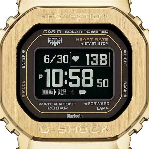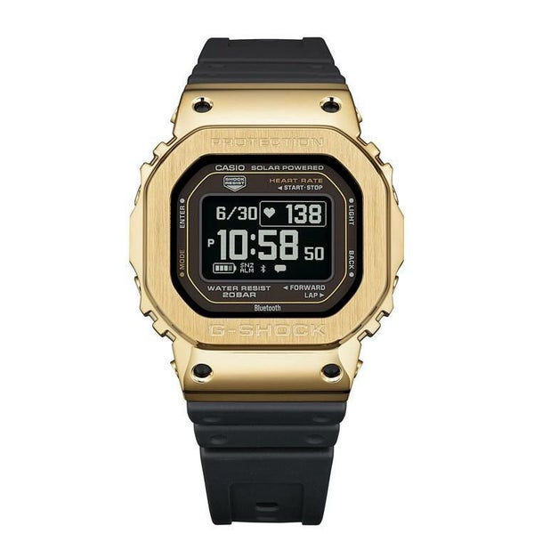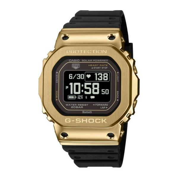 DW-H5600の機能はそのままに、ベゼル部分にステンレススチールを採用し、より幅広いシーンで着用できる仕上がりとしました。さらに、ベゼルのディンプル部分に4カ所の切削穴を設けることで、ハイテクギア感とスポーティーな印象を高めています。また、裏蓋にはカーボンファイバー強化樹脂ケースを採用。ワークアウトに役立つ機能として、心拍計測が可能な光学式センサー、歩数計測が可能な加速度センサーを搭載。ランニング、ウォーキングやワークアウトに対応しています。また、ポラール社ライブラリによるトレーニング解析、睡眠による回復度の解析、呼吸エクササイズ等が可能で血中酸素レベル計測機能も搭載しております。視認性の高い高精細MIP液晶を採用。USB充電とソーラー充電にも対応し、実用性も追求しました。