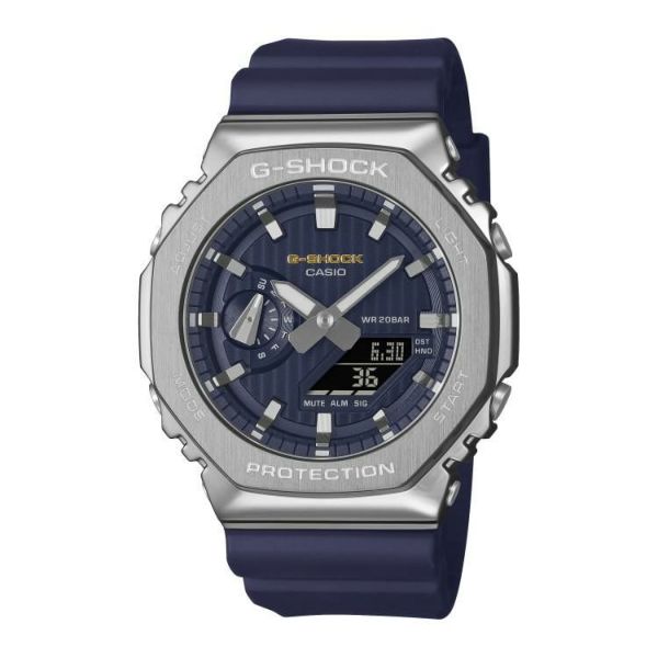 ベースモデルは人気のアナログ・デジタルコンビネーションシリーズの2100を採用。「夜空」をイメージしたネイビーカラーで、サイズ違いでペアになるよう展開しています。文字板のG-SHOCKのロゴのゴールドカラーは星の輝きを、文字板上のストライプパターンは星が降り注ぐ様子を表現しています。文字板にはメタル素材を採用し質感をアップしています。また、ベゼル・インデックスにはヘアライン加工を施しマットな質感に仕上げることで落ち着いた印象を与えます。大切な人に贈るホリデーシーズンのギフトにもピッタリなモデルです。(ペアモデル:GM-S2110SH-2AJF)