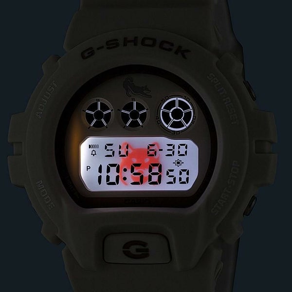 白柴をイメージしたオフホワイトのベゼルにオフホワイトバンドを採用。バンドは二色成形バンドとなっており、裏面は犬のお腹側をイメージしたホワイトになっています。LEDバックライトには柴犬の顔のイラストが浮かび上がり、文字板や裏蓋、遊環にも柴犬のシルエットがデザインされています。また、日本古来の犬種である柴犬にちなみ、made in Japanと生産地にもこだわりました。パッケージも特別仕様になっています。