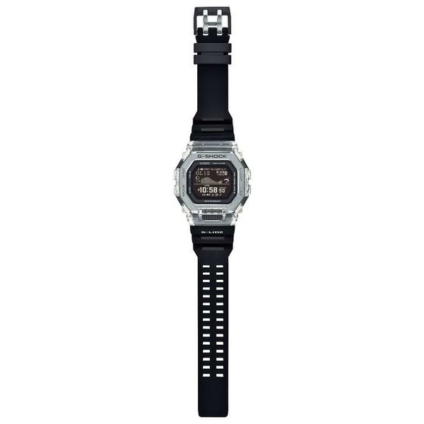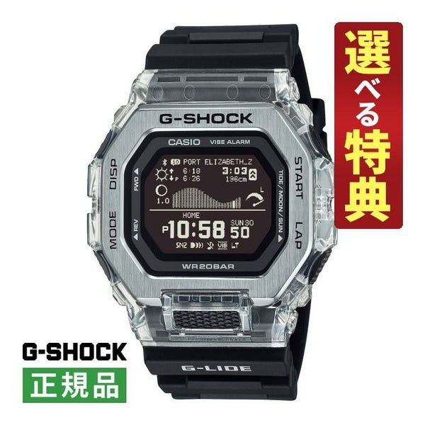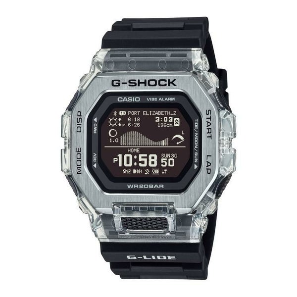 世界のトップサーファーから支持を受けるG-SHOCKのスポーツラインG-LIDEから、サマーシーズンに映えるマテリアル&カラーを纏ったモデルです。夏のサーフシーンをテーマに、陽射しを受けて煌めく波のイメージを2つの素材を組み合わせたベゼルで表現。トップにステンレススチールパーツを使用し、斜面をミラー仕上げに。ベース部には光沢感のあるクリアカラーのスケルトン樹脂を採用しました。バンドの主な樹脂パーツに、環境負荷低減への貢献が期待されるバイオマスプラスチックを使用しています。