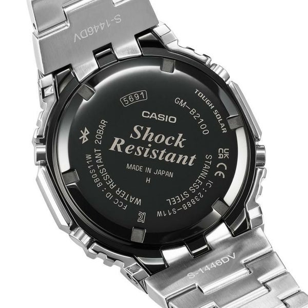 G-SHOCKのブランドカラーでもあり挑戦し続ける情熱を意味するレッド、高い防水性を表すブルー、ショックレジスタントを意味するイエローをあしらっています。ステンレススチール製のベゼルは、手間のかかる鍛造・切削・研磨加工を経て、立体的に成形し、天面をヘアライン、斜面をミラー研磨で美しく仕上げています。ステンレススチール製のケースは初代モデルと同じく、気密性に優れたスクリューバックケースを採用しています。フルメタルによる耐衝撃構造を実現するために、ベゼルとケースの間にはファインレジン製の緩衝材を実装。また、バンド接続部を3本足構造とし、連結パイプに加わる衝撃を分散。メタル製のバンドピースにディンプル加工を施し、初号機の樹脂バンドデザインを継承しました。製造も初代G-SHOCKを生み出したマザーファクトリー「山形カシオ」で行っています。