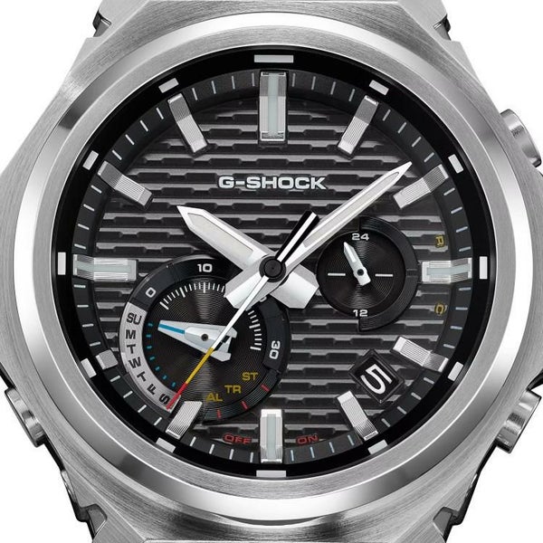 ロゴを排したベゼルは光の角度で表情を変え豊かな質感を演出。ステンレススチール製のバンドにはヘアライン仕上げとミラー仕上げを施し、三つ折れ式中留は端正なデザインとホールドが魅力です。G-SHOCK初号機“DW-5000C”から継承したベゼルデザインやレンガパターンが、スポーティさも加えています。メタルベゼルが衝撃をガードし、カーボンファイバー強化樹脂製のケースがモジュールを保護。さらに、ガラス接着方式や小型モジュールにより耐衝撃構造を実現しつつ厚みや重量を削減。快適な着け心地と実用性を両立しています。ビジネスからカジュアル、アウトドアまで多くの瞬間に対応できる「オールラウンド・タイムピース」です。