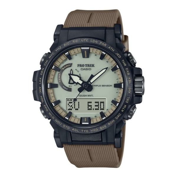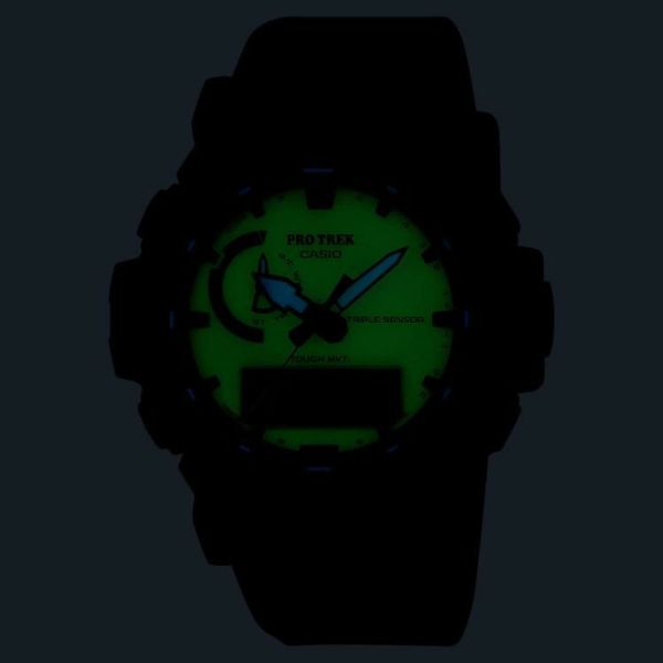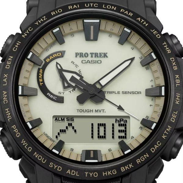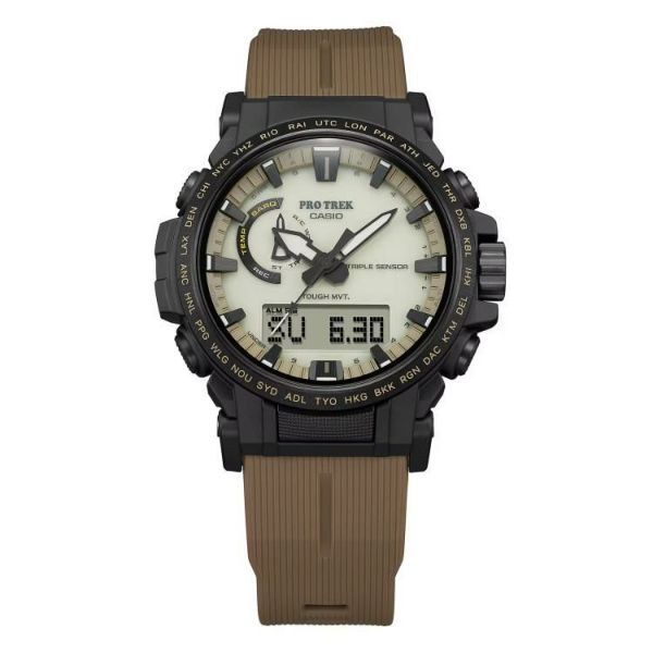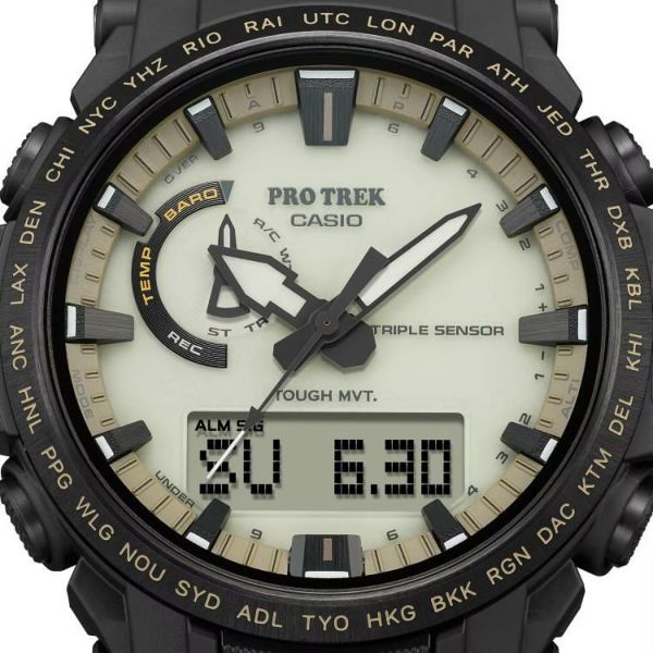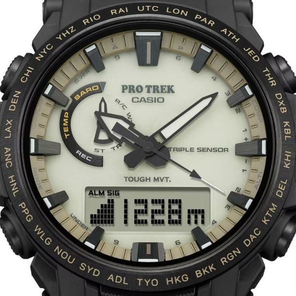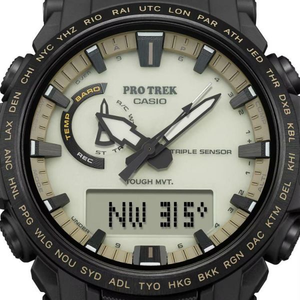 PRW-61LDは、夜間のアウトドアシーンでの実用性向上のため、全面蓄光文字板を採用しました。文字板のインデックスやバンドにダークコヨーテカラーを採用し、アウトドアにふさわしいカラーとしています。トリプルセンサーが掲載されているので、方位、高度/気圧、温度を計測できます。計測機能に加え、マルチバンド6やタフソーラーなど実用的な機能も兼ね備えます。夜間の視認性を高めキャンプなどの様々なシーンに対応する高い機能性と実用性を詰め込んだモデルです。