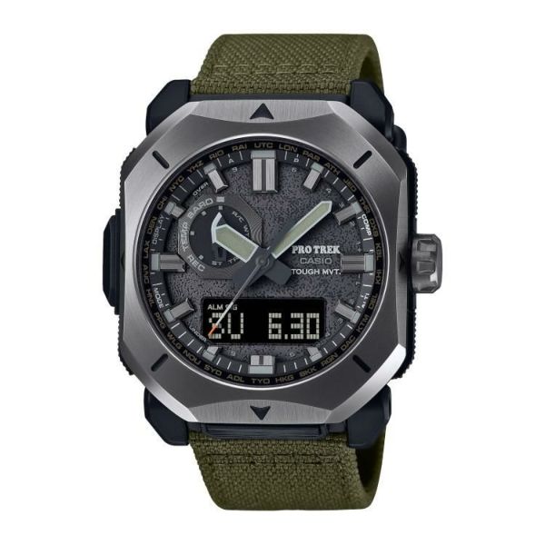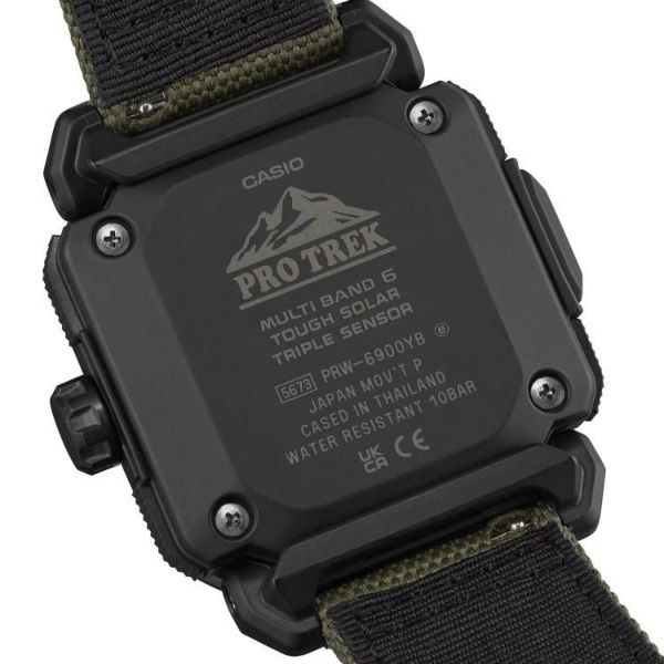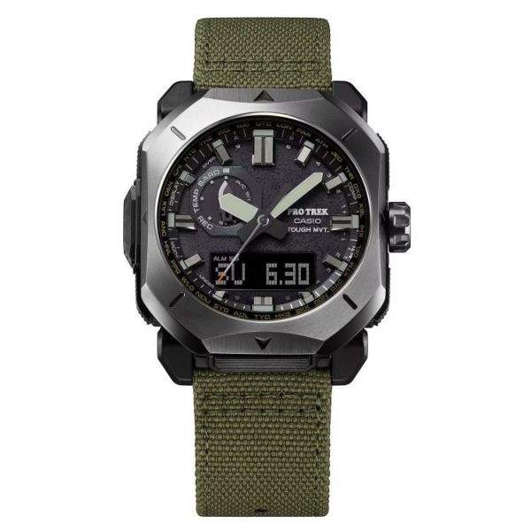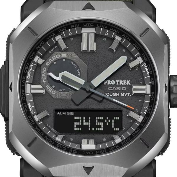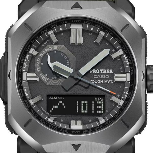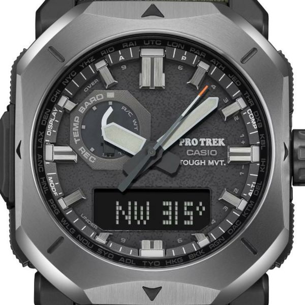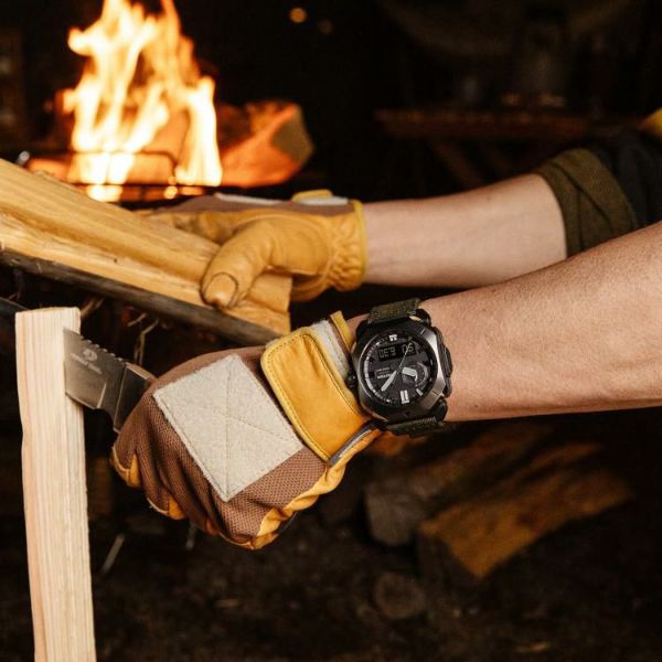 バンドには火の粉を受けても穴が開きにくい難燃処理を施したCORDURA(R) re/corを採用。テント素材にみられるカーキ色をベースに、アウトドアシーンでも街使いにも馴染むデザインに仕上げました。武骨な薪割りの斧をイメージしたメタルベゼルやアウトドアツールのナイフをイメージしたインダイアルの針でブッシュクラフトの世界観を表現。秒針の先には焚き火の残火をイメージさせるオレンジを配色しました。文字板の表面には、火にくべるダッチオーブンなどの鋳物を想起させるざらついたテクスチャーを凹凸感ある鍛造処理で表現しました。ケースおよび裏蓋にはバイオマスプラスチック樹脂を採用。トリプルセンサーが搭載されているので、方位、高度/気圧、温度を計測できます。マルチバンド6やタフソーラーなど実用的な機能も兼ね備え、様々なシーンに対応します。