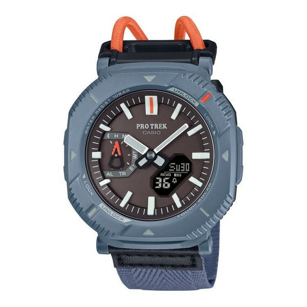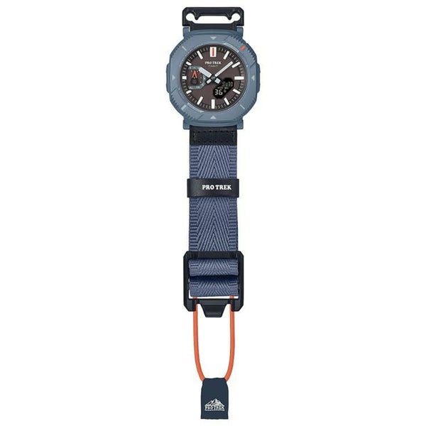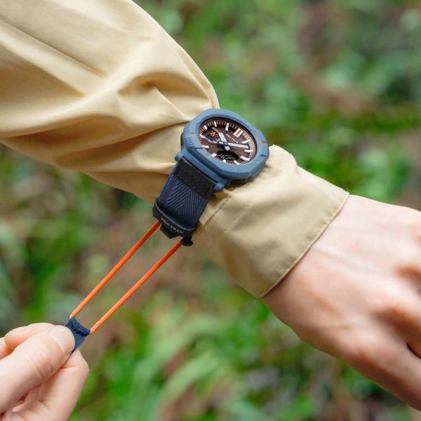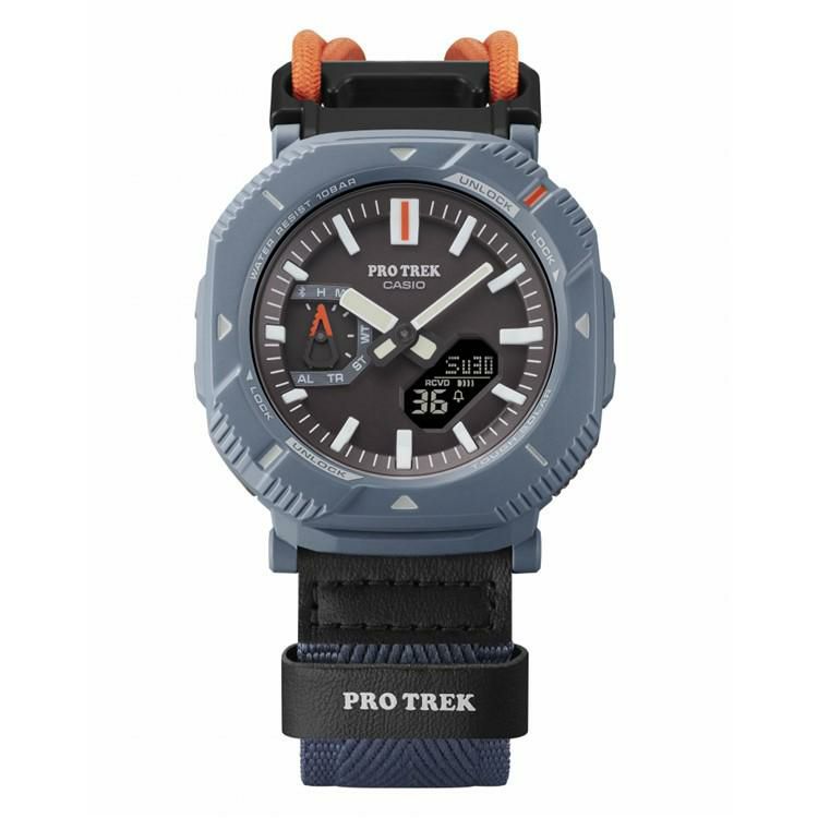 カラーリングは、自然と調和するチャコールグレー、オフホワイト、ダスティブルーのバリエーションを展開。時字やベゼルの蛍光カラーの差し色が、アウトドアファッションを彩ります。ケース、バンドなどの主な樹脂パーツには環境配慮型のバイオマスプラスチックを使用。加えて、タフソーラーやBluetooth(R)を搭載し、スマートフォン連携も可能です。