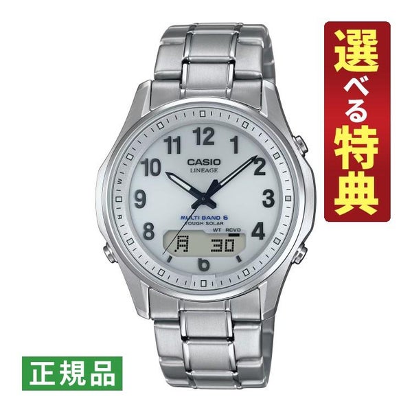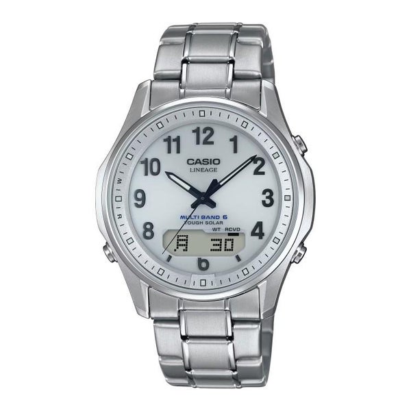 フルメタルケースのソーラー電波時計「LINEAGE」から、6時位置にデジタル表示による実用性を追求したコンビネーションモデルです。カレンダー機能のほかにワールドタイム、時刻アラーム、ストップウオッチ、タイマー機能を搭載。カレンダー機能の曜日表示は従来の日本語と英語表示に加え、ドイツ・スペイン・中国語の5カ国語表示が可能です。また、機能切替時にどの機能が表示されているかが一目でわかる機能アイコン表示や、どの機能からでもモードボタンの長押しで瞬時に時刻モードに戻るダイレクトリターン機能を搭載するなど、使いやすく工夫されています。ケース、バンドに軽量で錆に強いチタンを採用。フェイスデザインはシンプルに仕上げ、視認性も優れています。