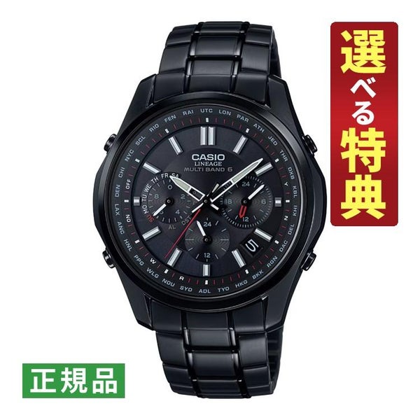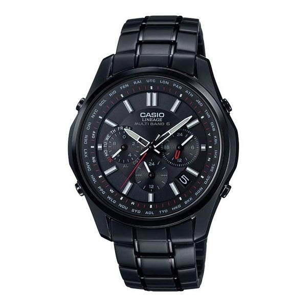 フルメタルケースのソーラー電波時計「LINEAGE」から、5モータークロノグラフモジュールを搭載したモデルです。薄さ10.6mmのスリムケースにストップウオッチ、ワールドタイム、タイマー、アラーム、日付・曜日表示、世界6局の標準電波に対応するマルチバンド6、タフソーラーを搭載。ケース、バンドにすべてブラックIP処理を施し、精悍な印象に仕上げています。
