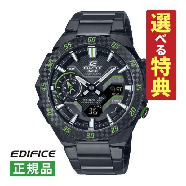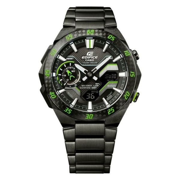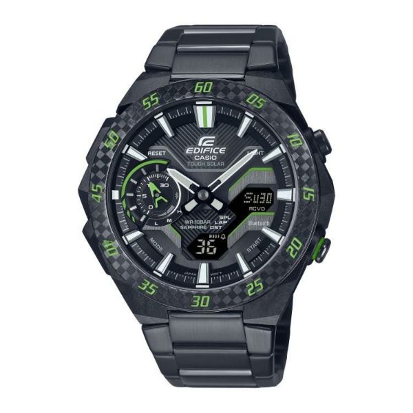 フォーミュラカーが走る時の空気の流れに着想を得てデザインされたEDIFICE ECB-2200 WINDFLOWに新しいバリエーションを追加します。WINDFLOWのカーボンファイバー強化樹脂ケースにカーボンファイバーベゼルとブラックIPを施したステンレススチールバンドの組み合わせ。そこにグリーンまたはイエローのアクセントカラーでレースマインドを感じさせるデザインに仕上げました。機能面ではスマートフォンリンク及びタフソーラーを搭載。Bluetooth(R)によりスマートフォンアプリと接続し、自動時刻修正による正確な時刻表示、約300都市から簡単に都市選択できるワールドタイム、1/1000秒単位のストップウオッチ計測データのスマートフォン転送、時計ボタンの長押しによりスマートフォンを鳴らす携帯電話探索などを可能にしています。タフソーラーは蛍光灯などのわずかな光でも発電します。
