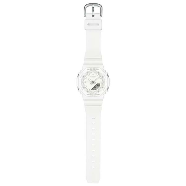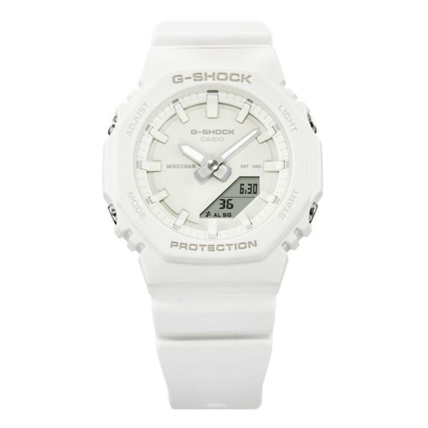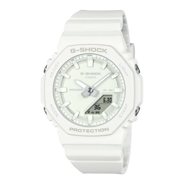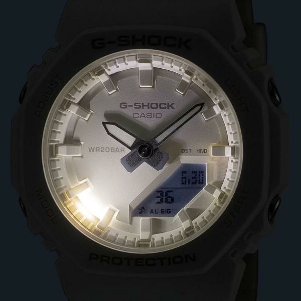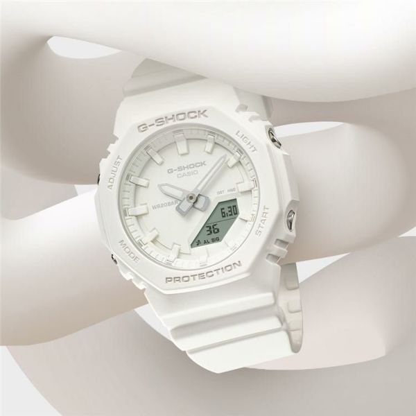 人気のデジタル・アナログコンビモデルGMA-S2100を更に小型化したGMA-P2100シリーズ。同時にバンドの長さも短くすることで、手首の細い方にもフィットするよう装着性を高めました。文字板、ロゴ、インデックス、針などのパーツにトーンの異なる同色を配色することで、表情に変化のあるデザインに仕上げると同時に視認性を高めました。美錠とサイドボタンもステンレス素材を使用し、質感を高めています。GMA-S2100にあった9時側の小針をなくし、シンプルでミニマルな印象になるように仕上げました。ベゼル、バンドにはバイオマスプラスチックを採用。着ける人を選ばないサイズ感と共に、シンプルなデザインながらもディテールにこだわったモデルです。