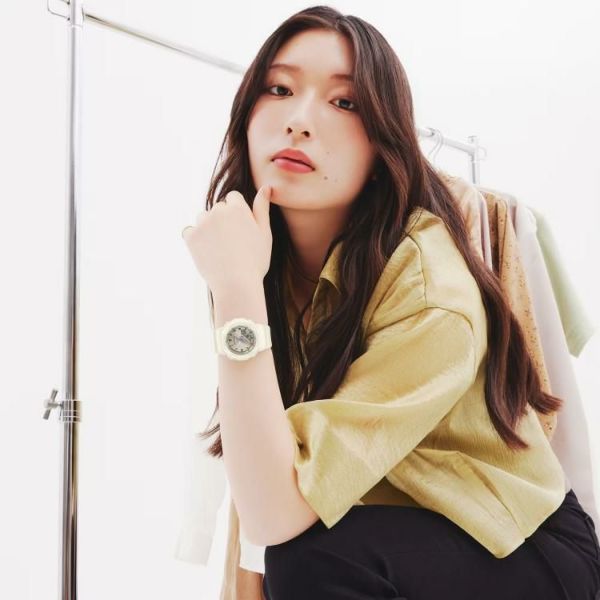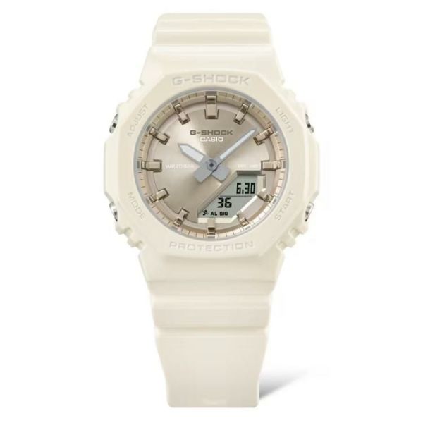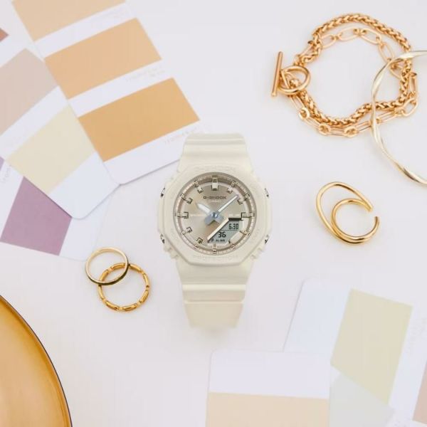 小さなサイズとシンプルなルックスに、シルクのような質感のGMA-P2100シリーズです。ベゼルとバンドにマット仕上げの偏光パール塗装を、文字板には美しい輝きを放つ艶消しのメタリックカラーをあしらい、ミニマルデザインのシンプルな表情に華やかさをプラスしました。優しい色合いとさりげない光沢感が腕元を上品に彩ります。また、ベゼル、バンドの主な樹脂パーツにはバイオマスプラスチックを使用し、環境にも配慮しました。