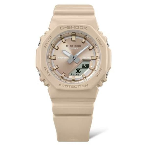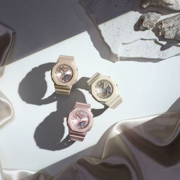 小さなサイズとシンプルなルックスに、シルクのような質感のGMA-P2100シリーズです。ベゼルとバンドにマット仕上げの偏光パール塗装を、文字板には美しい輝きを放つ艶消しのメタリックカラーをあしらい、ミニマルデザインのシンプルな表情に華やかさをプラスしました。優しい色合いとさりげない光沢感が腕元を上品に彩ります。また、ベゼル、バンドの主な樹脂パーツにはバイオマスプラスチックを使用し、環境にも配慮しました。