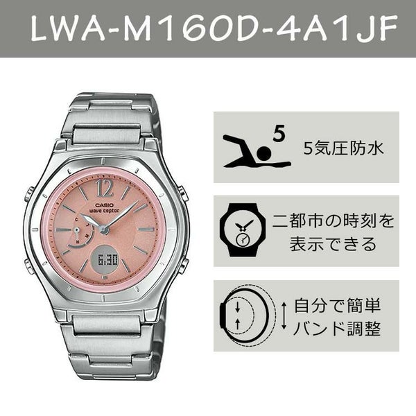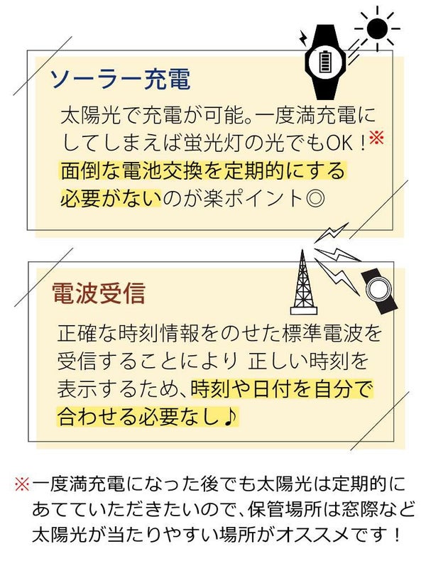 日本2局・中国・アメリカ・イギリス・ドイツの標準電波に対応したマルチバンド6のソーラー電波時計です。曜日や日付、アラームなどを表示する便利な小窓が付いた2針タイプ。9時位置にはバッテリーの残量を示すバッテリーインジゲーターを搭載しました。