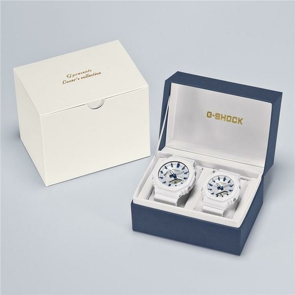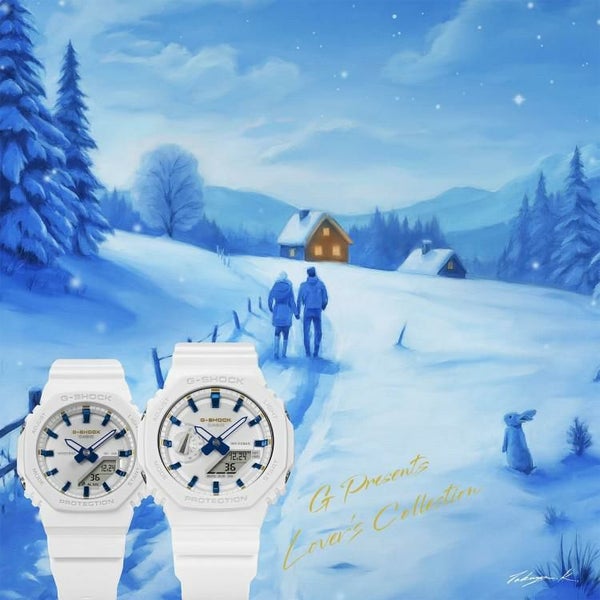 ホワイトダイアルに透明蒸着を施し質感を高め、インデックスにはブルー蒸着を施し、シルバー・ゴールドの差し色がクリスマスの華やかさを演出。マットホワイトのベゼルとバンドに、G-SHOCKロゴおよびアワーマーカーのゴールドが特別感を添えています。裏蓋には、ラバーズコレクションのシンボルである「天使&悪魔」の刻印を配し、大切な人との絆を見守ります。スペシャルパッケージはキーカラーのホワイト×ブルーを基調とした特別感のある仕様に仕上げました。クリスマスの贈り物として、大切な人と共に身に着けたいモデルです。