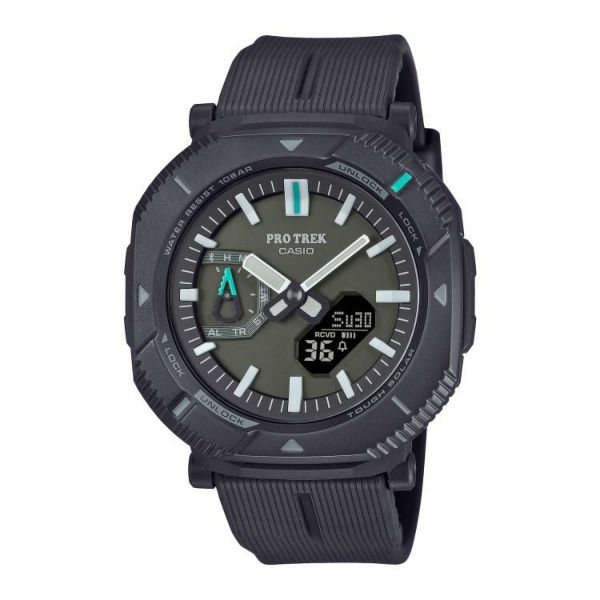 このモデルはロータリーガードベゼルを初採用。このベゼルを回すことで、2つのスタイルに切り替えることができます。普段使いしやすいスタイリッシュな角形スタイルではボタンが隠れ、歩行中やタウンユース時の誤操作を防止します。一方、アクティビティ時など機能を多用する場面では、ベゼルを45度回すことでボタンが現れ、操作しやすい形状に変化します。長時間使用においても、ストレスの少ないソフトウレタンバンドで、自然と調和するカラーリングを採用。時字やベゼルの蛍光カラーの差し色が、アウトドアファッションを彩ります。ケース、バンドなどの主な樹脂パーツには環境配慮型の「バイオマスプラスチック」を使用。加えて、タフソーラーや、Bluetooth(R)を搭載し、スマートフォン連携も可能です。時計のボタン操作で、現在の時刻と位置を専用アプリの地図上に記録し、行動ログとして管理ができます。これにより、絶景スポットなどの思い出を振り返ったり、再訪したい場所を備忘録として残すことができ、アウトドアの楽しみ方を広げることができる最軽量のモデルとなっています。