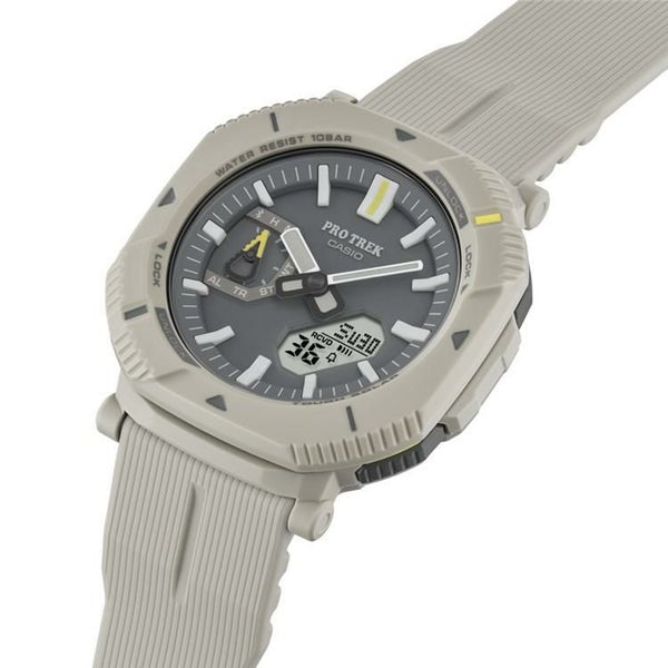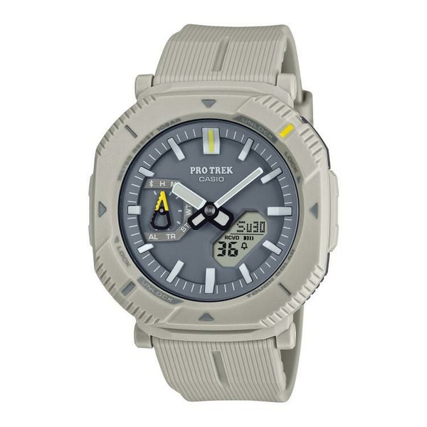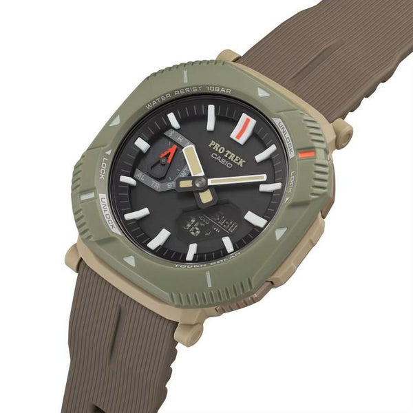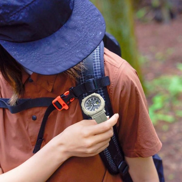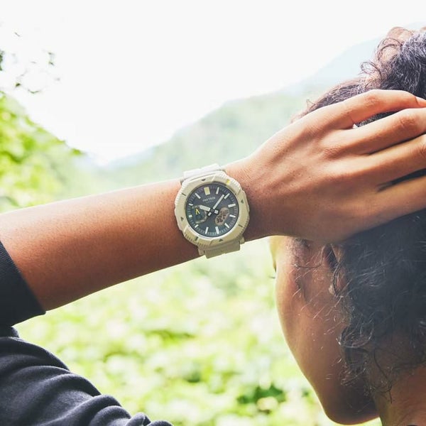 このモデルはロータリーガードベゼルを初採用。このベゼルを回すことで、2つのスタイルに切り替えることができます。普段使いしやすいスタイリッシュな角形スタイルではボタンが隠れ、歩行中やタウンユース時の誤操作を防止します。一方、アクティビティ時など機能を多用する場面では、ベゼルを45度回すことでボタンが現れ、操作しやすい形状に変化します。長時間使用においても、ストレスの少ないソフトウレタンバンドで、自然と調和するカラーリングを採用。時字やベゼルの蛍光カラーの差し色が、アウトドアファッションを彩ります。ケース、バンドなどの主な樹脂パーツには環境配慮型の「バイオマスプラスチック」を使用。加えて、タフソーラーや、Bluetooth(R)を搭載し、スマートフォン連携も可能です。時計のボタン操作で、現在の時刻と位置を専用アプリの地図上に記録し、行動ログとして管理ができます。これにより、絶景スポットなどの思い出を振り返ったり、再訪したい場所を備忘録として残すことができ、アウトドアの楽しみ方を広げることができる最軽量のモデルとなっています。