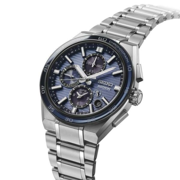 結晶の如く凝縮された光を纏う、ワンランク上のハイエンドモデルに相応しい風格を備えたスポーティエレガンスデザインが特徴。美しい光沢を放つ透明感のあるサファイアガラスベゼルとケース斜面に施した大胆な鏡面仕上げが、ハイエンドモデルに相応しい輝きを纏った、洗練された佇まいと高級感を演出。12時/6時位置のサブダイヤル植えパーツの目盛りをダイヤカットで彫り込み、質感の高いホリゾンタル(横縞)の型打ちパターンを採用することで、緻密で凝縮された輝きを放つダイヤルデザインを実現。腕なじみの良い低重心のチタンケースに高級感のあるデュアルカーブサファイアガラスを採用。鏡面仕上げと筋目仕上げのパーツを組み合わせた、質感の高い5列ブレスレットが腕元でエレガントな雰囲気を醸成。裏ぶたには、ASTRONブランドを象徴するグローブマークを立体的にレイアウトしたハイエンドモデルならではの特別仕様。