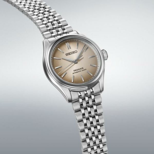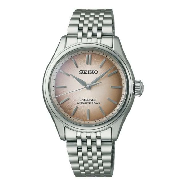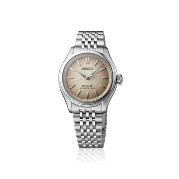 クラシックシリーズより、トラッドな趣向にマッチする小径サイズ(36mm)モデルが登場。ダイヤルの型打ちは小径サイズでも見ごたえのある、絹糸をイメージした繊細な放射模様を施しました。ダイヤルの美しさを最大限引き出すため、あえてカレンダー表示を無くし、ヴィンテージテイストを表現しています。ダイヤルカラーには、柴木で染めたくすんだ茶色で、江戸時代に流行した柴色を採用。奥深いダイヤルとレトロ感のある繊細な多列ブレスレッドが、トラッドな雰囲気を醸成します。