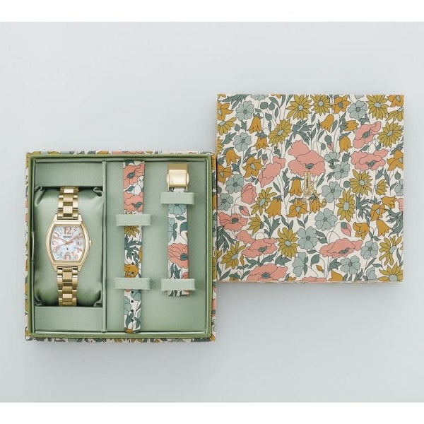 日常生活を彩る女性の身近なアイテムとしての共通点をもつルキアから、リバティ・ファブリックスを付け替え用ストラップとスペシャルボックスにあしらった、特別な限定モデルが登場です。