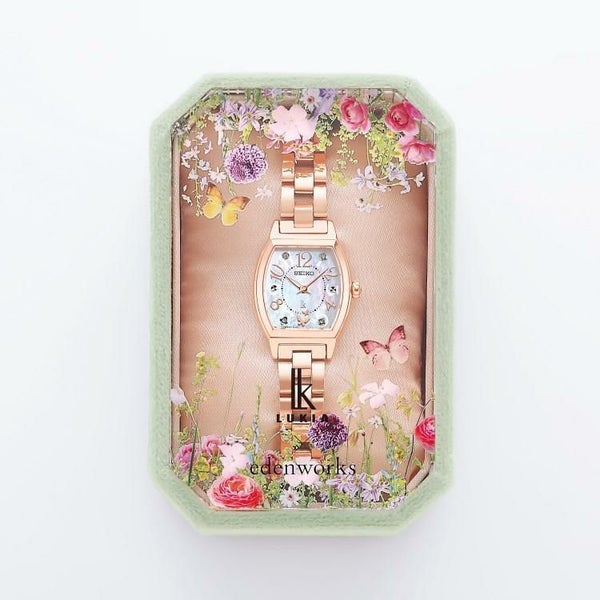 ルキアのブランドパートナーであるedenworksとコラボレーションした当モデルでは、花々が満開に咲き誇る幸福感溢れる様子を、白蝶貝ダイヤル外周部に表現しました。傾けることで花のパターンがさりげなく輝くデザインです。30分を指す位置でもある6時位置から舞い上がる蝶2匹と3時位置の1匹、合計3匹の蝶が30周年を祝福しています。ケースのカラーリングはedenworks篠崎恵美氏のセレクト。ボックスは共同制作によるもので、アクリル天面には篠崎氏の手によるフラワーインスタレーションの写真を落とし込みました。