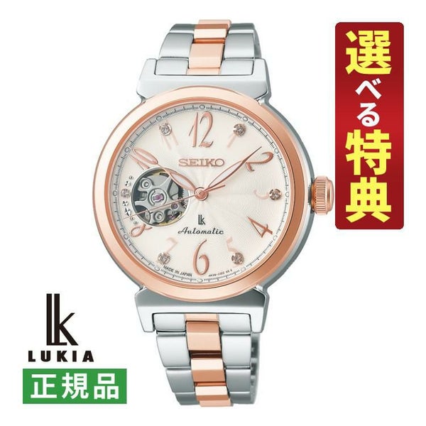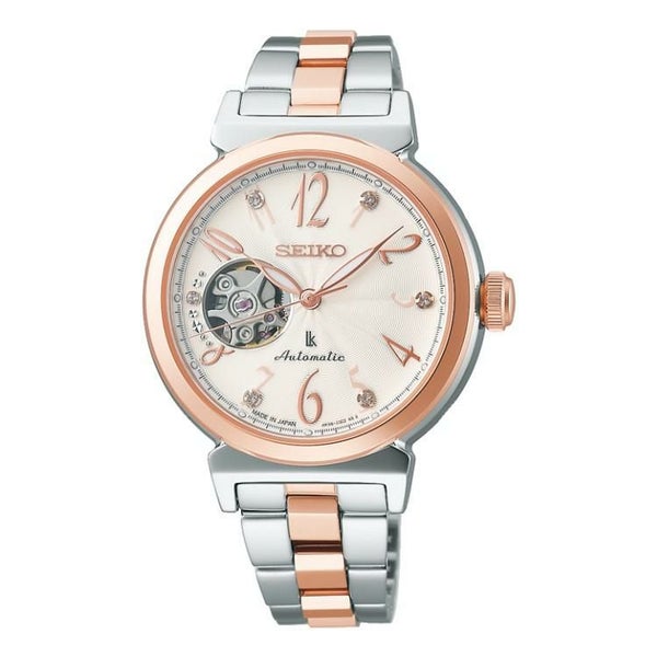 ダイヤルは、すっきりエレガントな佇まいのアラビアフォントと、淡いピンク~透明のクリスタルガラスを組み合わせたルキアで人気のレイアウトです。9時位置にオープンハートをレイアウトし、メカニカルらしい表情が楽しめるデザインとなっています。その左側にはクリスタルガラスとともに植え略字をレイアウトし、ルキアならではのビジュー感あるオープンハートのデザインとなっています。ケースはコの字型のカン足フォルムを採用し、ボリューム感のあるケースでありながら軽やかさを感じさせます。
