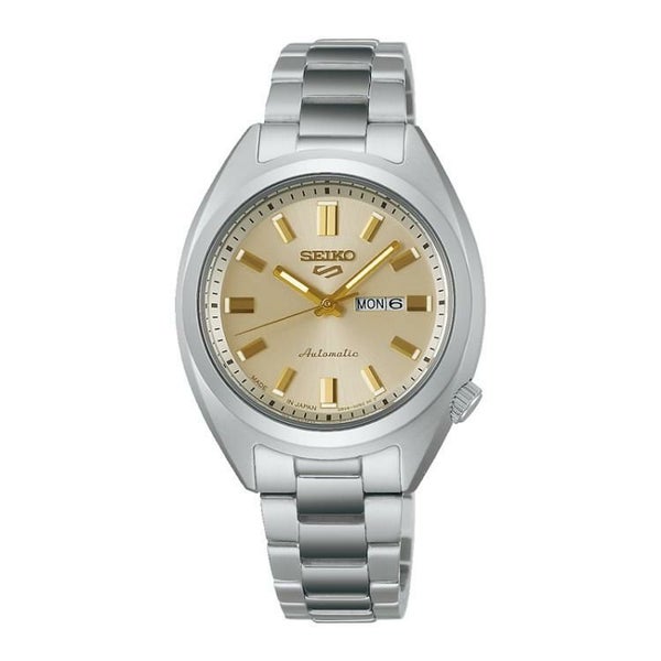 綺麗めファッションに合わせやすい、32mmのSNXSが新登場。SNXSシリーズ初の2R06キャリバーを搭載。ケース形状は、SNXSの特徴である“へびたま”形状(蛇が卵を飲み込んだようなケース形状を指す)を踏襲し、稜線に鏡面と筋目の仕上げ分けを施した高級感のある仕上げ。略字の上面全体に筋目加工(虹挽き)を施したほか、ピッチの細かい新規形状のメタルブレスレットを採用。金属植え略字の質感を活かした、綺麗めなファッションやアクセサリーに合わせやすいゴールドのキーカラーが特徴。ダイヤル色は、クラシカルな印象を持つケース造形にマッチするカラーを選定。SRRA011のダイヤルは、SBSA295と近似のシャンパンゴールド色を採用。