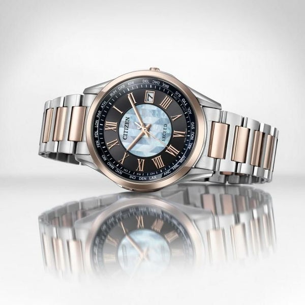 確かな品質と洗練されたデザイン。大人のためのドレスウオッチ、シチズン EXCEED(エクシード)。「誓いの矢」をテーマに、カットした白蝶貝を貼り合わせて矢羽根の模様を表現。新しい手法で豊かな表情を演出した限定モデルです。