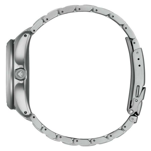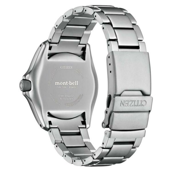 メタルバンドは硬化処理によりキズがつきにくく、さらに衝撃で外れないよう配慮されたダブルロックバックルを使用しています。裏ぶたレス構造のケースバックには、モンベルのブランドロゴをレーザー刻印。CITIZEN×mont-bellのロゴが入った専用ボックス付きです。