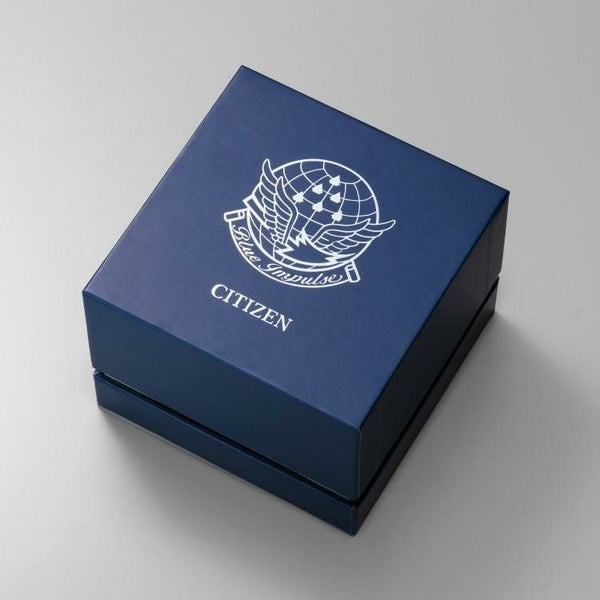 2025年に創設65周年を迎える航空自衛隊アクロバット飛行チーム「ブルーインパルス」から着想を得た限定モデルです。ケース径40mmのコンパクトなサイズで、腕が細い方にも違和感なくフィット。より多くのブルーインパルスファンの心をとらえる、使いやすい1本です。ブルーインパルスのチームカラーを想起させるブルーとシルバーの配色が、力強さと爽やかさを感じさせます。文字板と裏ぶたに、ブルーインパルスのエンブレムをレイアウト。専用ボックスの中には、ブルーインパルスの現行機種T-4の飛行シーンを印刷したカードが入っています。