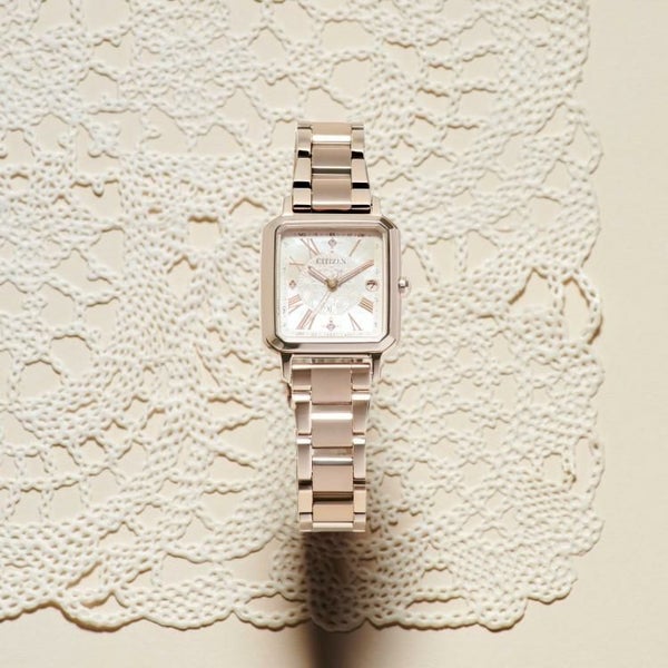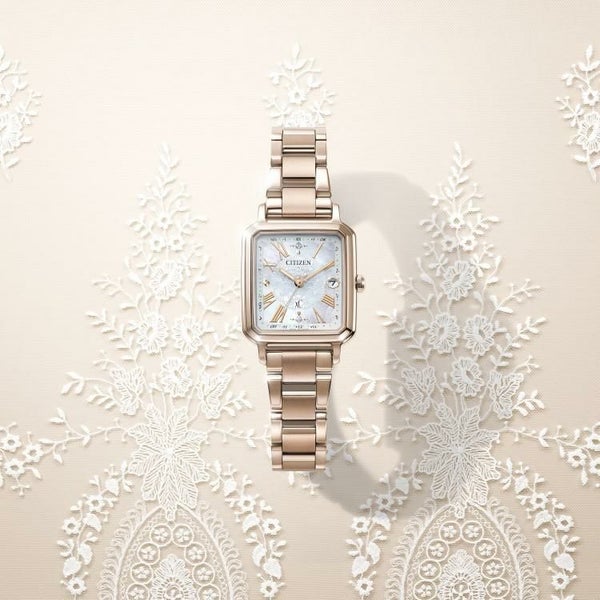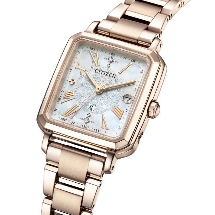 前を向く女性を応援するエンパワーウオッチブランド、シチズン xC(クロスシー)。サクラピンク(R)のケースと白蝶貝文字板を生かした、hikari collectionスクエア2wayモデルの限定仕様。アンティークレースをモチーフにしたクラシカルなデザインです。