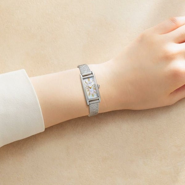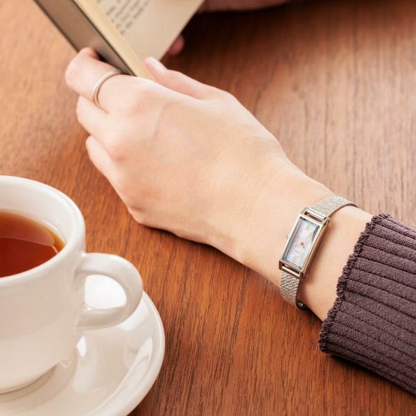 華奢でありながら凜とした佇まい、スリムなケースが人気のスクエアモデルをベースに、美しい白蝶貝文字板を合わせた限定モデルです。文字板中央に、ギョーシェ彫りを思わせるパターンを施し、高級感と華やかさをきわだたせています。クラシカルな印象のメッシュバンドに、付け替え可能な革バンドをセットした2Way仕様。ご自身で手軽にバンド交換ができるインターチェンジャブル構造です。シルバーケースのモデルには、手元をクールに彩るネイビーの革バンドをセット。メイクやファションに合わせて印象が変えられます。