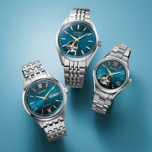 中国で生まれ、日本の伝統色としても知られる瑠璃色の一種、「金碧珠(きんぺきしゅ)」をテーマにした、日本国内限定のメカニカルモデル。金碧とは金色と青緑色の組み合わせを意味し、大海から朝日が昇る様子を表しています。シンプルな3針のデイ&デイト付きモデル、ペアウオッチにもできるオープンハート仕様のメンズ&レディスモデルをラインアップしています。青く広がる美しい海から金色の朝日が昇る情景を描いた文字板。深みのある青のグラデーションにピンクゴールドのインデックスを組み合わせた、上品で華やかなデザインです。ミラー&ホーニング仕上げの針を採用し、視認性を確保。裏ぶたは、回転する錘(おもり)やメカの動きを楽しめるシースルーバック仕様です。
