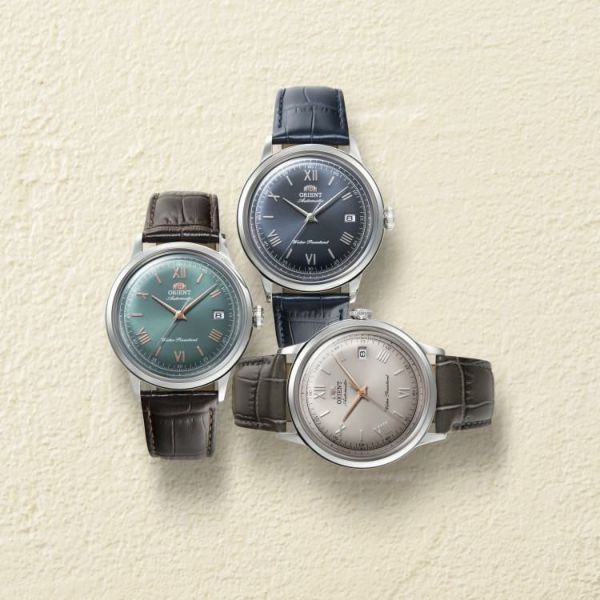 新しいカラーリングによる文字板は、放射目のグリーン、ネイビー、ベージュの3色をラインアップ。文字板の美観を強調するのは、ニュアンス豊かな各色との色彩効果を計算してピンクゴールドやシルバー色を巧みに使い分けたローマ数字や針です。これによって、クラシカルな『オリエントバンビーノ』が普段使いしやすいファッショナブルな時計へと生まれ変わりました。