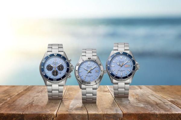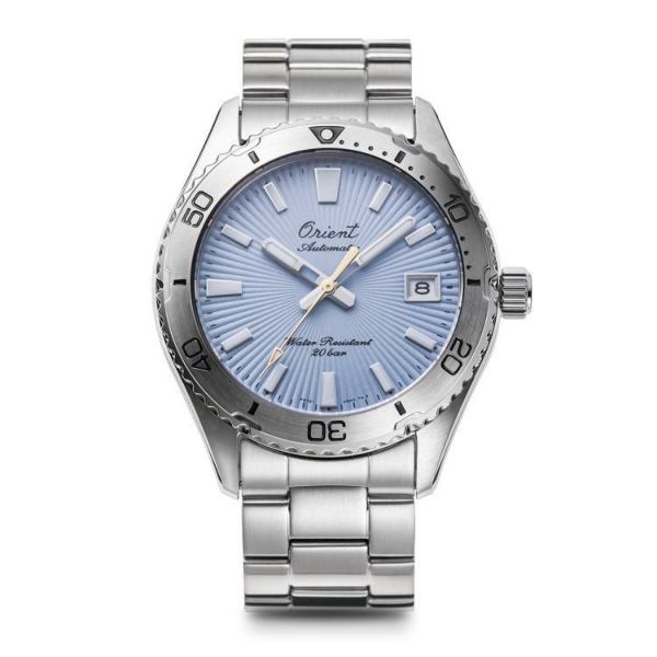 数量限定モデルのテーマは「青空と風を切るような爽快感」。アクティブなシーンに映えるスカイブルーの文字板、風を思わせる放射の型打ち模様、太陽光をイメージした秒針、そして1950年代に用いられていた筆記体の旧オリエントロゴなどの共通仕様が特別感を強調しています。