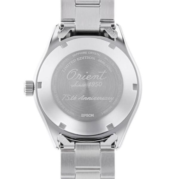 また、スクリューバックとねじ込み式りゅうずにより20気圧の防水を確保したケースのうら蓋にも、筆記体による「Orient Since 1950 75th Anniversary」の文字と数量限定シリアル番号の刻印が記されています。